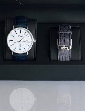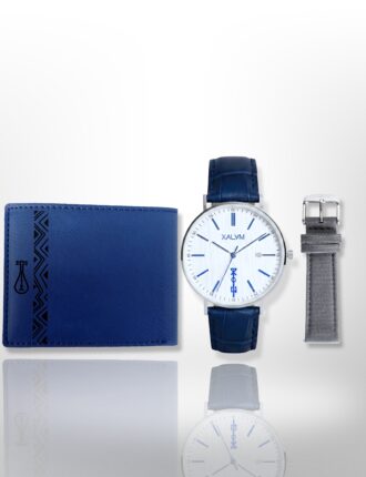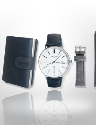 Coffret spécial Homme, 3 en 1 composés d'une montre MANDOU (LITE), d'un bracelet de rechange en cuir Bleu Croco et d'un porte-carte KALPÉ. Personnalisation en option