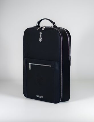 Sac d’ordinateur à dos / porte-documents unisexe en cuir saffiano noir et finitions métalliques Gold. Dimensions: 39x27x9cm Double compartiment à soufflets spacieux et optimisés pour un rangement facile de votre ordinateur portable, tablette, documents et petits accessoires. Intérieur nebuck doux noir. Porté main, à dos ou en bandoulière grâce à ses 3 sangles amovibles. Peut accueillir un ordinateur portable jusqu’à 16 pouces dans son compartiment principal (14 pouces pour la partie interne dédiée à l’ordinateur, 10 pouces pour la partie dédiée à la tablette).