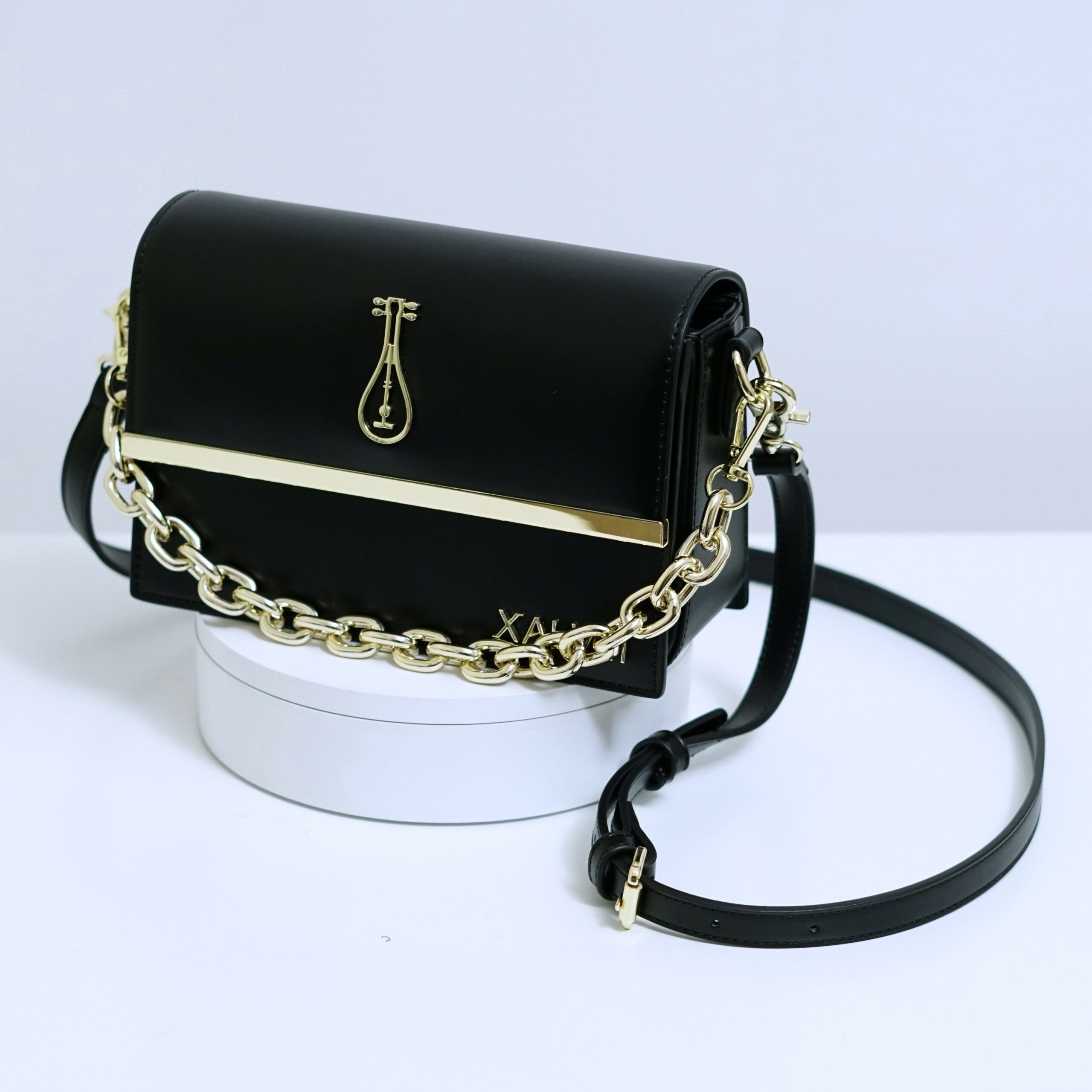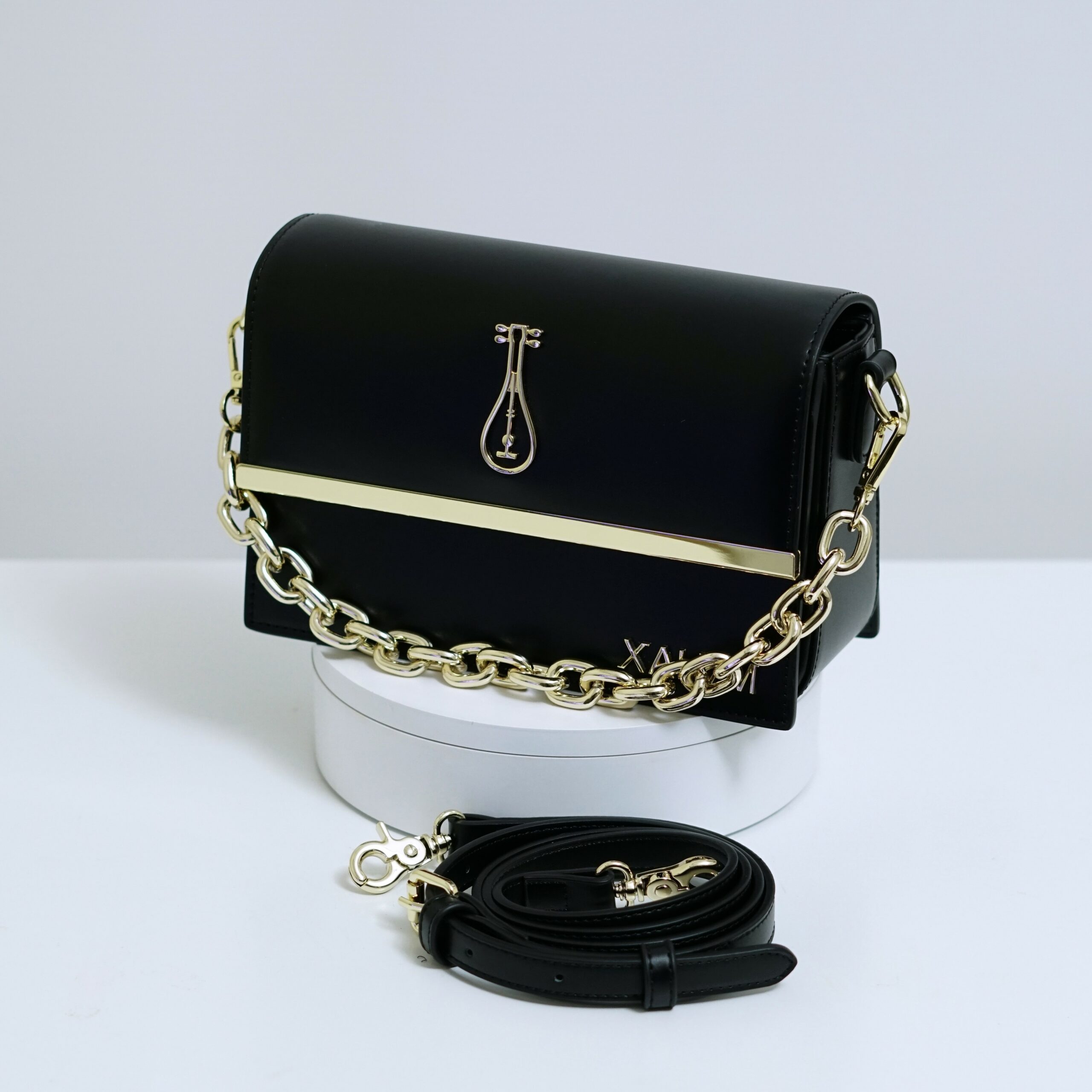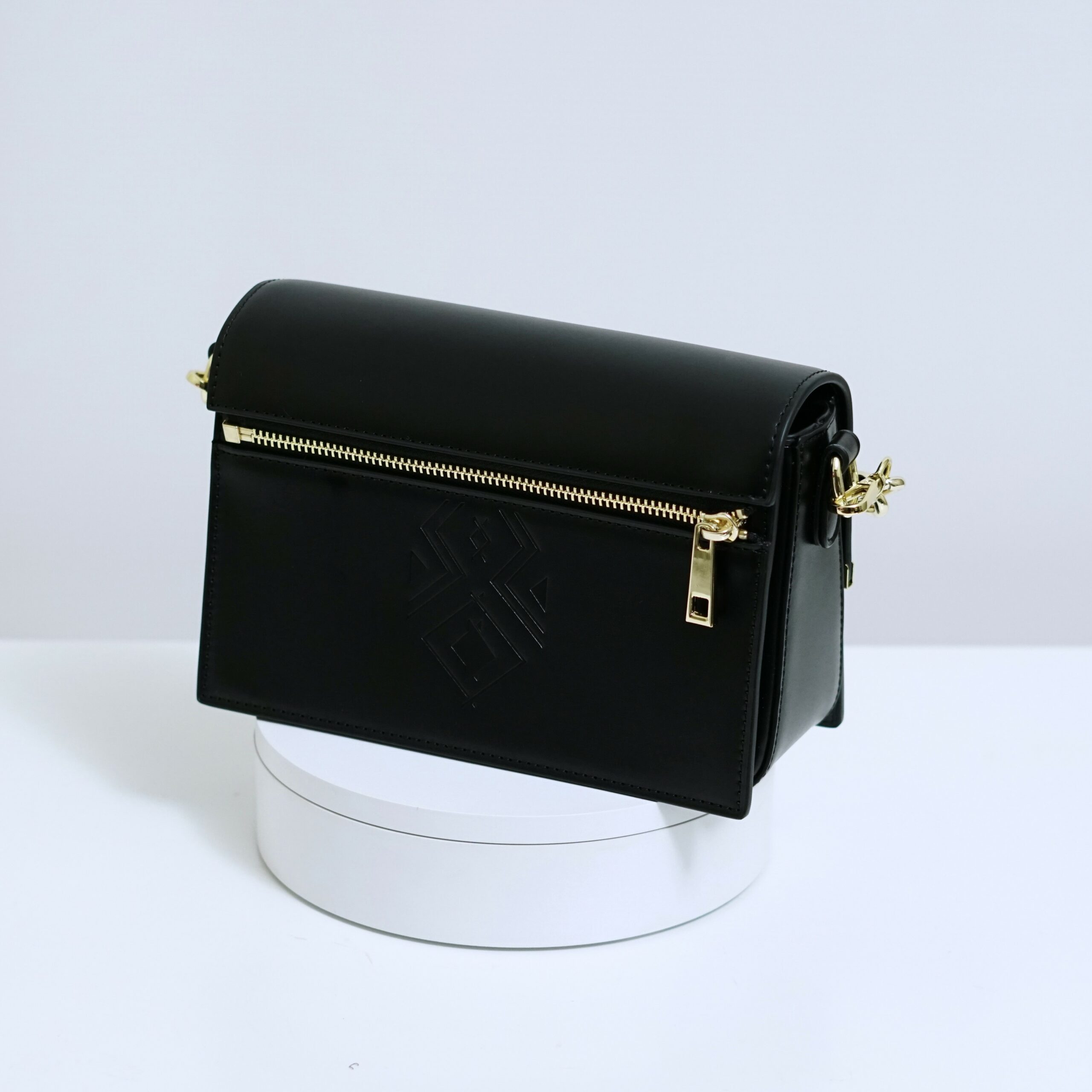 Sac principal: Sac à Main en cuir lisse couleur noire et finitions métalliques Gold. Rabat en cuir démontable et interchangeable grâce à une fermeture éclair arrière, compatible avec nos rabats de rechange. Intérieur en tissu lourd noir avec une poche interne zippé et deux poches latérales ouvertes. Anse en métal Gold et Bandoulière ajustable en cuir. Dimensions: 20*15*8cm
