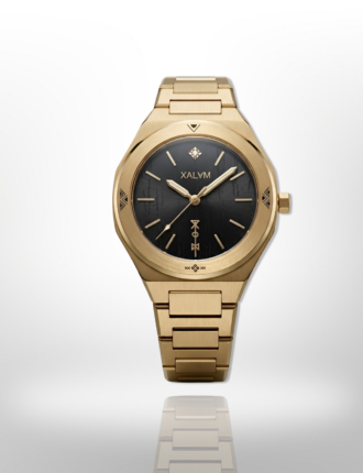 Boitier Gold: octogone sur les bords + orbit orné de motifs à gravures creuses effet noir: 34mm, épaisseur 9mm